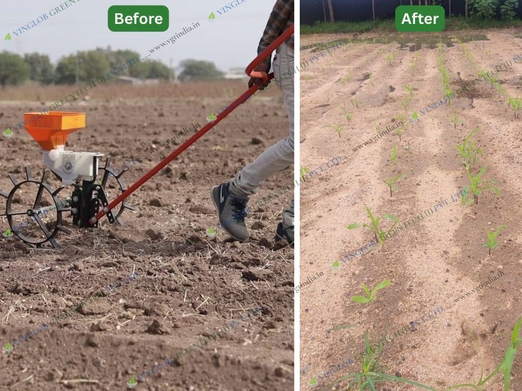 The Manual Seed Drill was designed for sowing seeds in limited spaces. It has a cup cell type mechanism for seed and fertilizer metering. Seeds that can be planted by using this tool are wheat, ground nuts, cotton, castor, maize, cumin, soya, sunflower, paddy (dry land), and all varieties of grains, cereals, and pulses.
